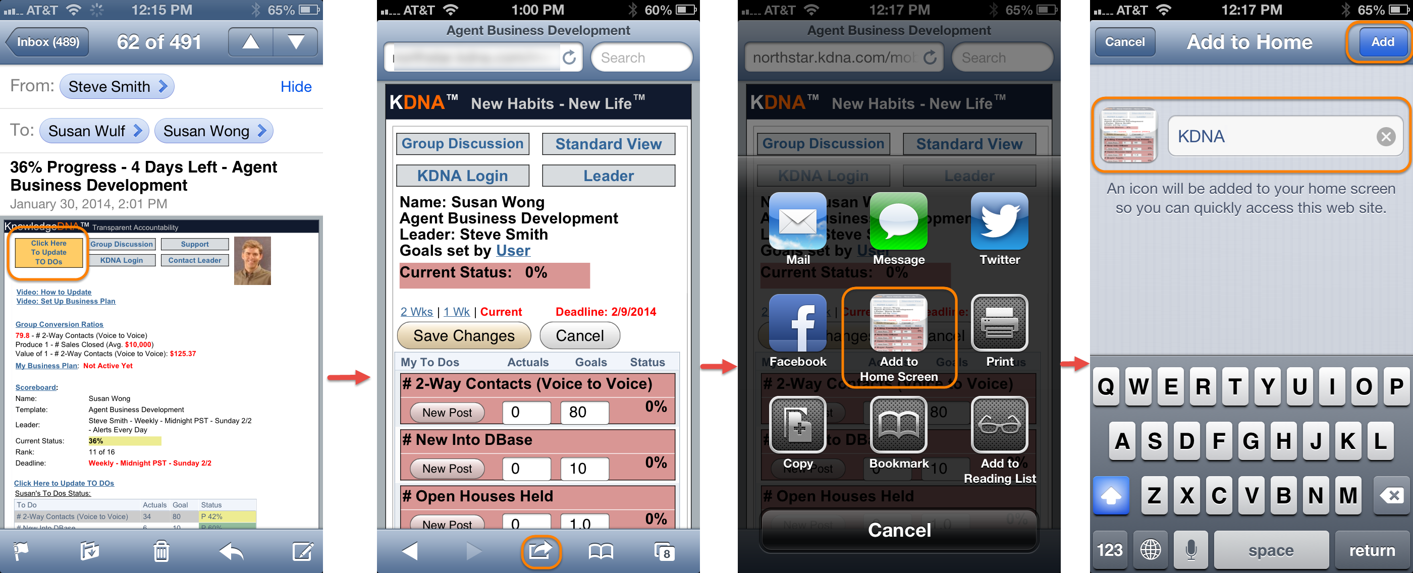 There is not currently a Smart Phone app for KnowledgeDNA. You access your tracker input page through your browser on your Smart Phone. You can create an icon on your phone's home page so that you can more easily access KDNA (ie. You don't have to find the daily email.) However, the security code for the web address does expire every 30 days. So, once your icon no long works you will need to repeat these steps: